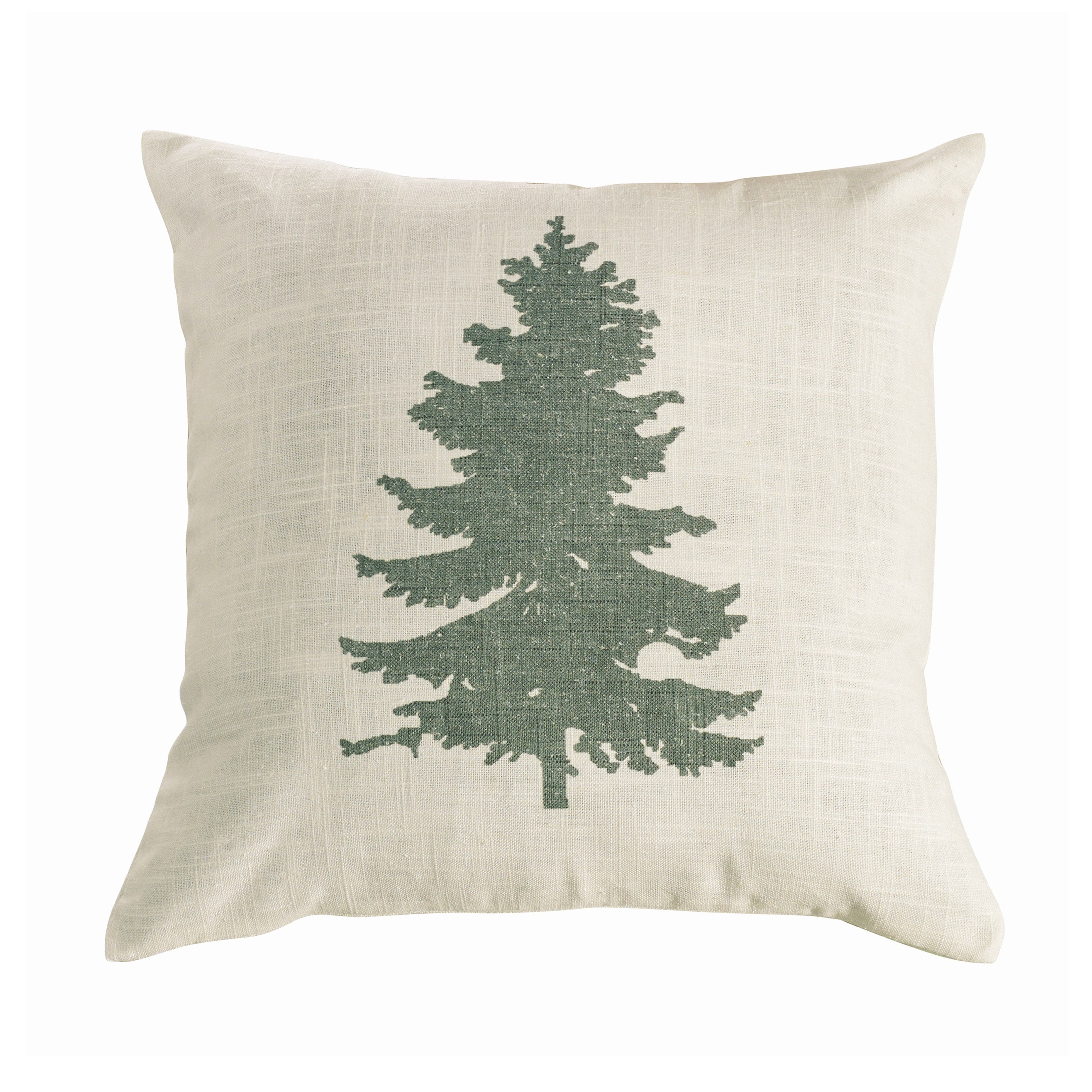 Muted olive green lone pine tree printed on cream linen adorn this square accent pillow, making it an enchanting addition to your mountain lodge.