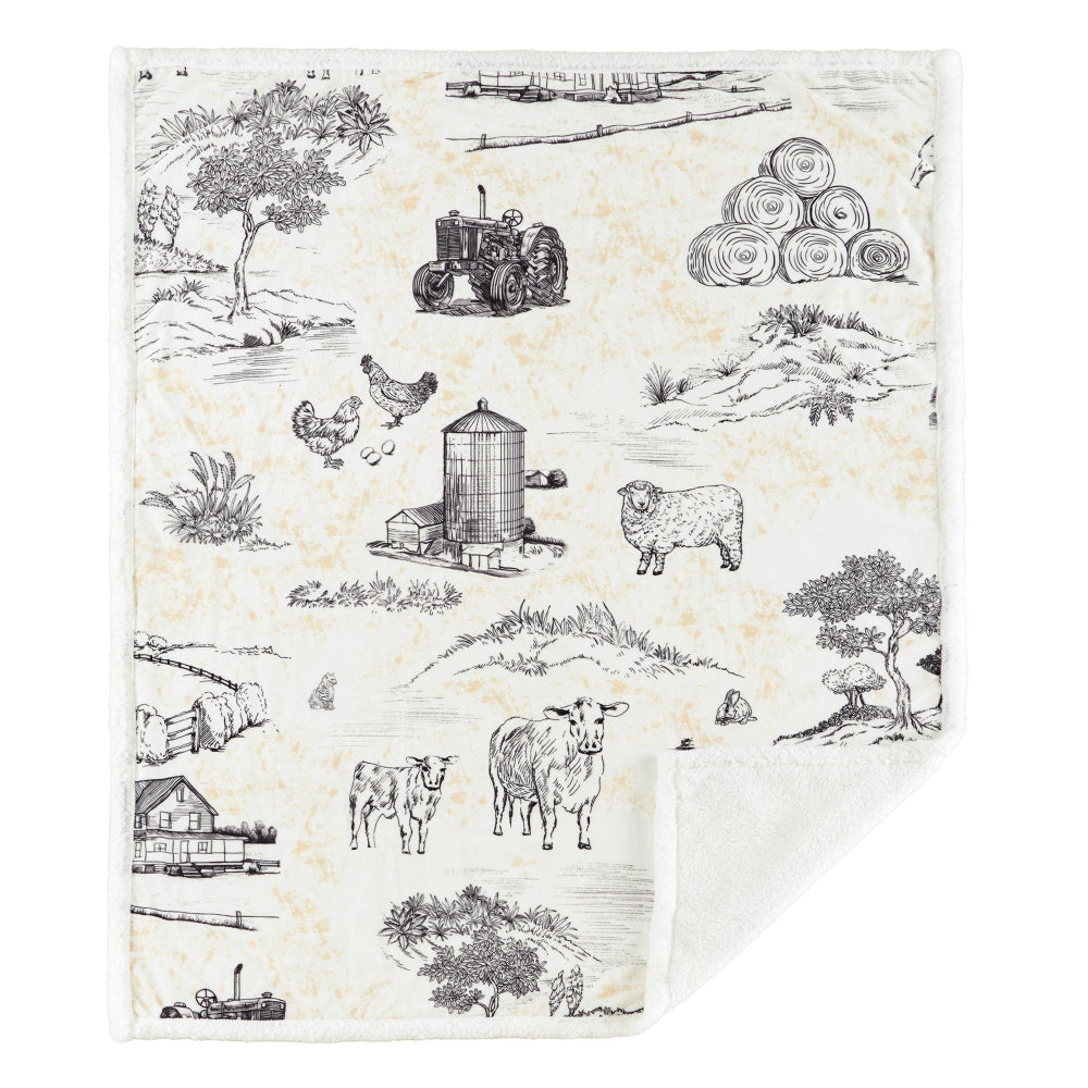 Bring the heart of the countryside home with the Farm Life Campfire Sherpa Throw, a cozy companion adorned with pastoral scenes of cows, chickens, haystacks, tractors, and open fields. Rendered in your choice of blue or brown against a soft cream backdrop, each colorway evokes the quiet beauty of rural living, where days move slowly, shaped by quiet care, honest work, and the timeless rhythm of the land. Backed with plush sherpa for warmth and comfort, this throw is as inviting on a cool evening as it is curled up on the couch year-round. Easy to care for and thoughtfully priced, it’s a comforting layer of farmstead charm for everyday moments. Part of our Campfire Throws Collection.
